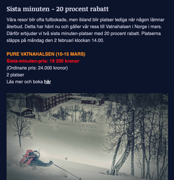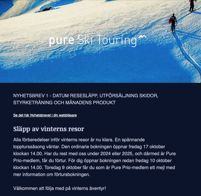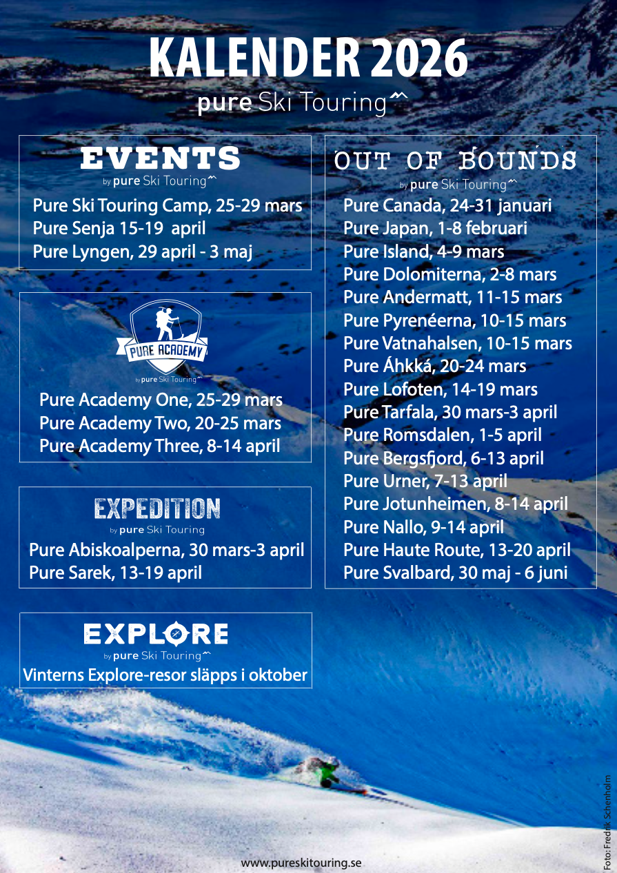 Vi erbjuder toppturer i världsklass där vi reser till de allra bästa topptursområderna i världen. Grundlig research och stor nyfikenhet leder oss till lämpliga bergsmassiv. Varje resa är unik då vi erbjuder endast en avgång per år till varje destination. Vi använder oss enbart av certifierade IFMGA bergsguider. Våra förberedelser är omsorgsfulla och kraven på kvalitet höga. Allt för att våra gäster ska få en så förstklassig och inspirerande topptursupplevelse som möjligt.